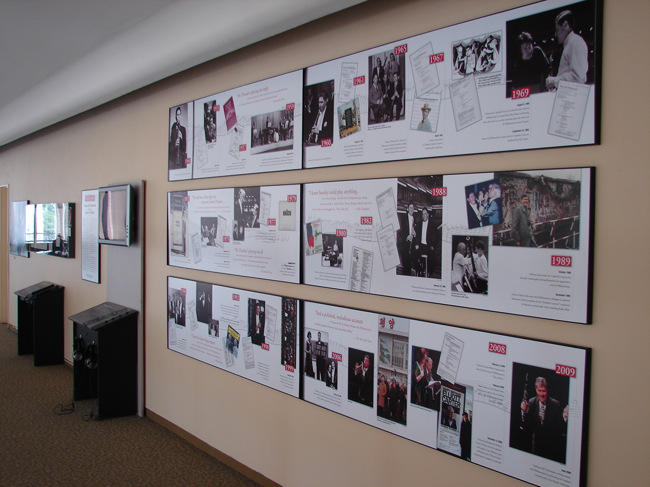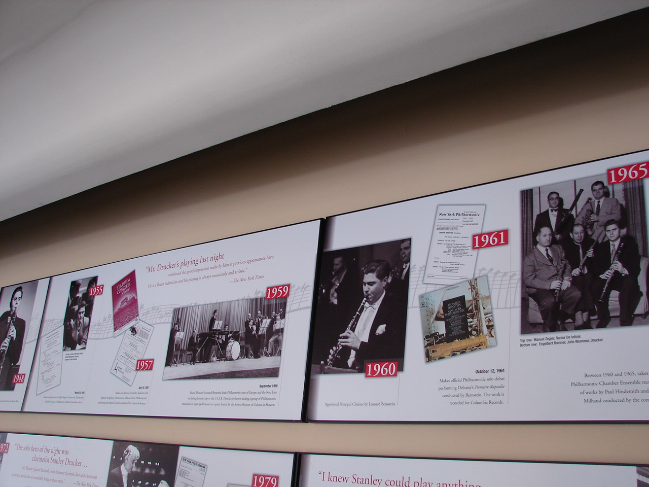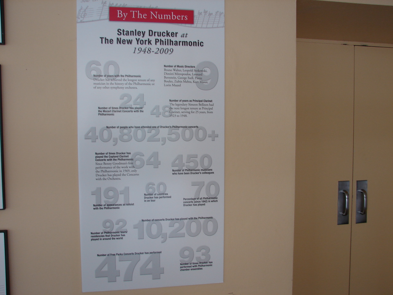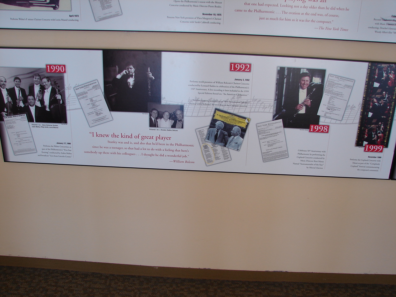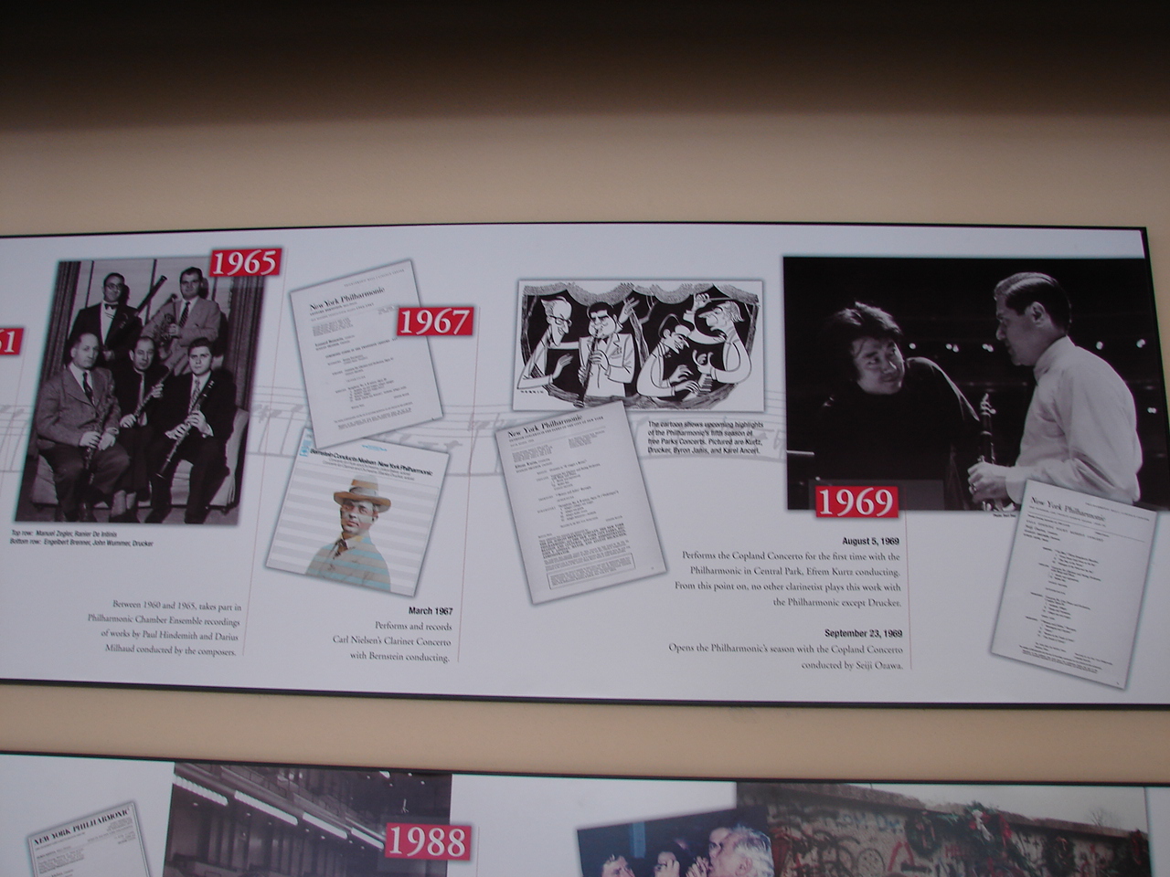 Without exaggeration, this evening with Soloist Stanley Drucker performing the Aaron Copland Clarinet Concerto for the last time after over 60 years in the Philharmonic and soloist in this work over 60 times, is the most important and inspiring evening of the year. The affection and admiration of his legacy is nothing less than awe-striking- to have a presentation at the concert before his appearance on stage, and given a standing ovation before he performed sends a telling message. Like many other previous performances, he clearly owns the piece as stated in the National Public Radio coverage of his career. The concert was sold out, and the public had a generous opportunity to see in exhibit what Maestro Drucker was all about. The numbers are on display at an exhibition in a corridor at Avery Fisher Hall that traces his career and provides clips of interviews and performances. It was organized by Amy Shapiro, Mr Drucker's biographer and a PhD candidate at the State University at Stony Brook, a former student who is writing a doctoral dissertation about the Philharmonic through his experiences. At a private preview last week, a subdued Mr. Drucker seemed moved. “It’s overwhelming,” he said softly.