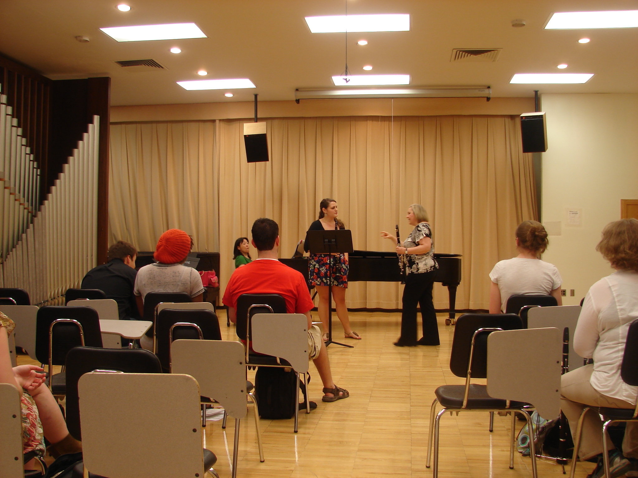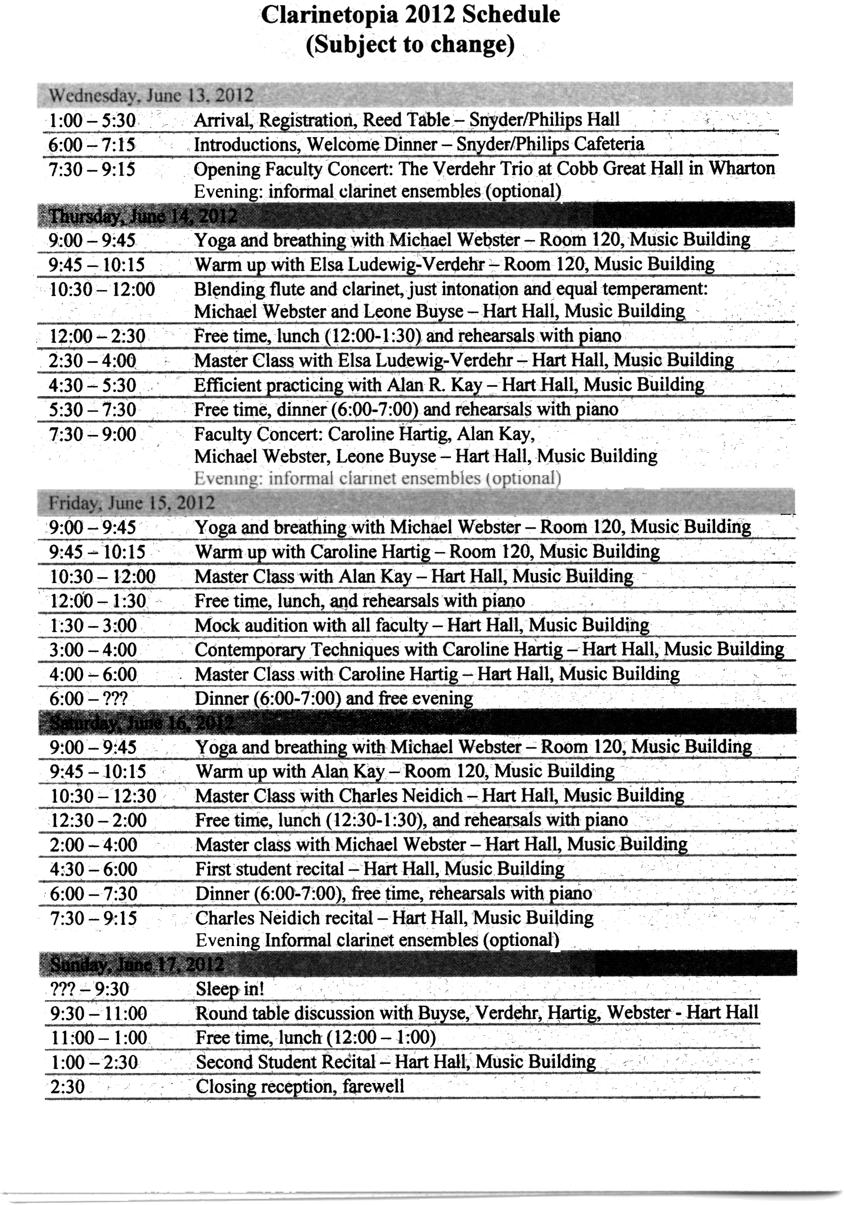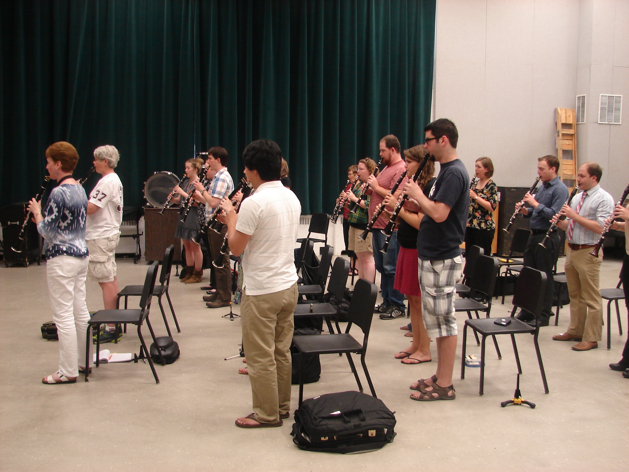 Thirty-one clarinetists from as far away as the Dominican Republic, Canada, Montana, Texas, Virginia and Georgia met on the campus of Michigan State University for Clarinetopia 2012 between June 13 and 17. They shared four concentrated days of master classes, faculty and student recitals, and faculty presentations, which included reed making and adjusting, yoga and breathing, audition preparation, intonation, efficient practicing, and contemporary techniques. On the faculty were two New Yorkers, Charles Neidich and Alan R. Kay; two representatives from MSU, Elsa Ludewig-Verdehr and Caroline Hartig; and two Houstonians, Michael Webster and Leone Buyse, who likes to refer to herself as “the token flutist.”