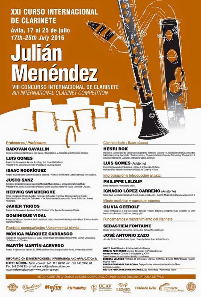 Julian Menendez International Clarinet Festival and 8th Competition and Bass Clarinet with VIP Henri Bok - Avila, Portugal - 17 - 25 July 2016