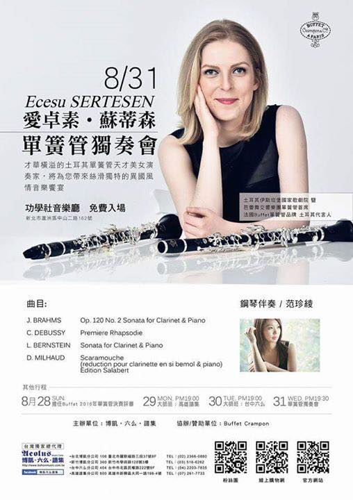 Ecesu Sertesen - Solo Clarinetist at the Istanbul State Opera and Ballet Orchestra (Turkey) in parallel with her International Solo and Chamber music career, participating as Soloist, Master Class Teacher, and Judge in Tiawan with the Buffet International Clarinet Competition