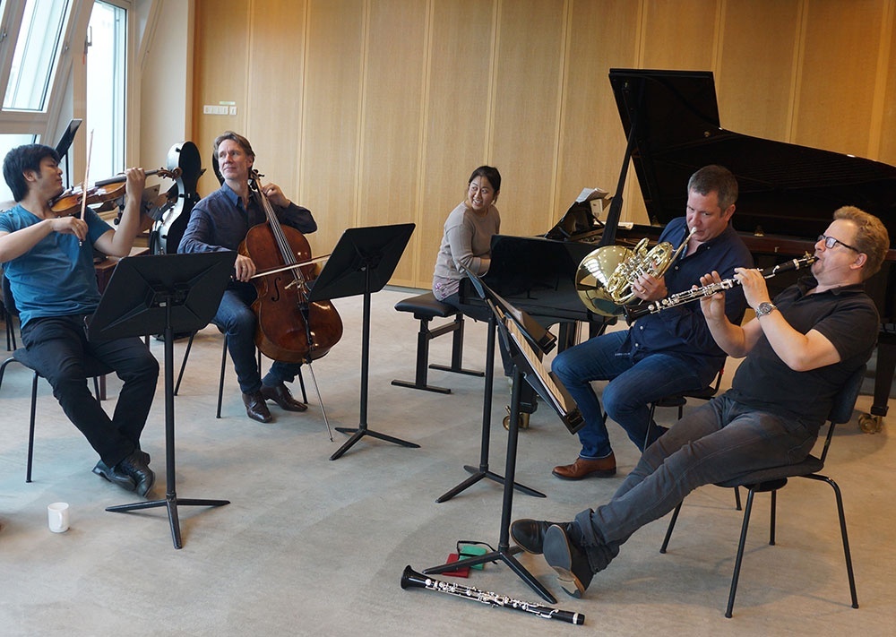 Berlin Philharmoniker Chamber Concert with VIP's Wenzel Fuchs, Stefan Dohr with Daishin Kashimoto (violin) Olaf Maninger (violoncello) Wenzel Fuchs (clarinet)... Stefan Dohr (horn) Yu Kosuge (piano) Program: Brahms Trio for horn, violin and piano in E Flat Op.40 Brahms Trio for clarinet, cello, and piano in A minor Op.114 Fibich Quintet for violin, horn, clarinet, cello and piano in D op.42 -