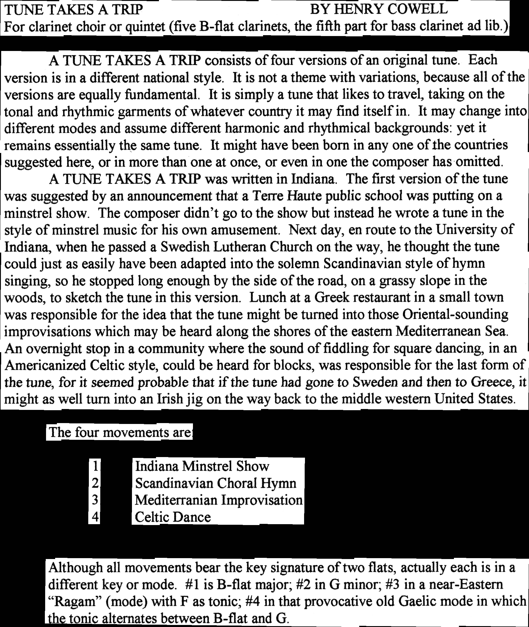 Cansino, an award-winning California composer of choral, orchestral, operatic and chamber music (including a song cycle for soprano, clarinet and piano, “Seven Songs” of ee cummings) wrote “The Great Clarinet Circus” for the Los Angeles Clarinet Choir in 2005. Inspired by the composer’s childhood recollections of the great Sad Clown, Emmett Kelley, the work is also a tribute to American composer Charles Ives, with the Finale quoting Ives’s famous song “Circus Band.” The composer’s vision of the work includes optional theatrical: the group marches in from offstage during the first movement (Parade); the soprano clarinets hold up their bells to “trumpet” during “Mighty Elephants”; and the 8th movement, Fanfare, precedes“ a circus act of the conductor’s choice” which may be a sword-swallower or chainsaw juggler or an extraneous musical piece performed by a member of the group. The first California performance included a mime in clown face and a dancer attired as master of ceremonies changing large circus cards that announced individual movements. The composer envisions a noisy circus atmosphere, including applause between movements.
