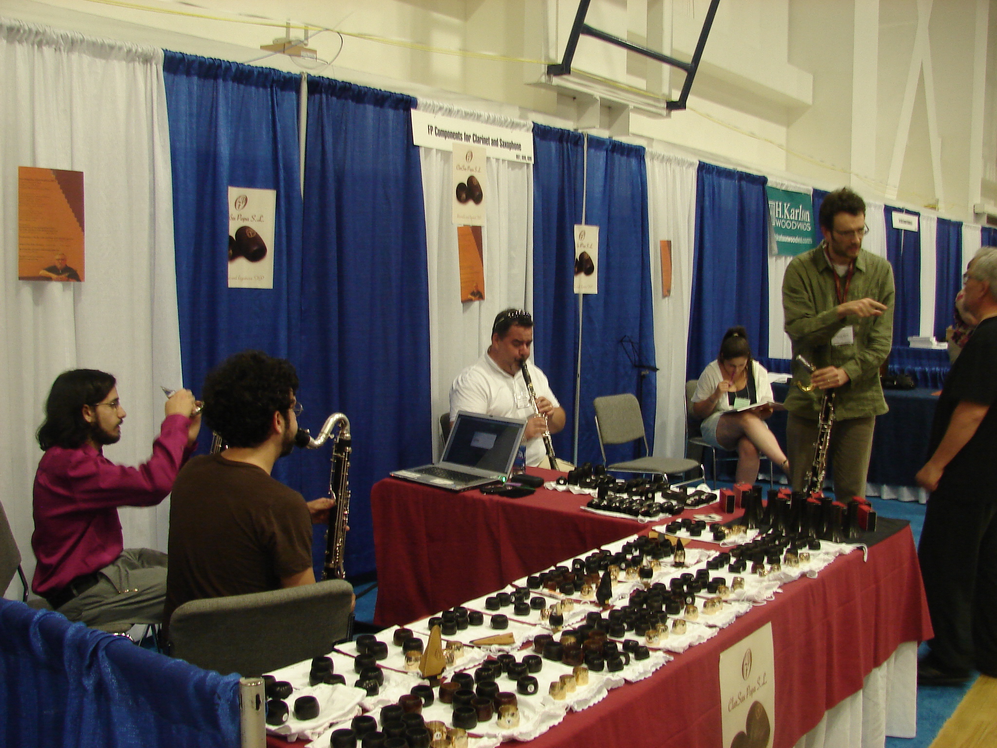 Industry exhibits covered two large rooms at the University Fitness Center and had over 100 firms representing the entire instrument industry with products to try, buy, and also publishers, software music firms, accessories as reeds, mouthpieces, all of which come each year with new things to show.