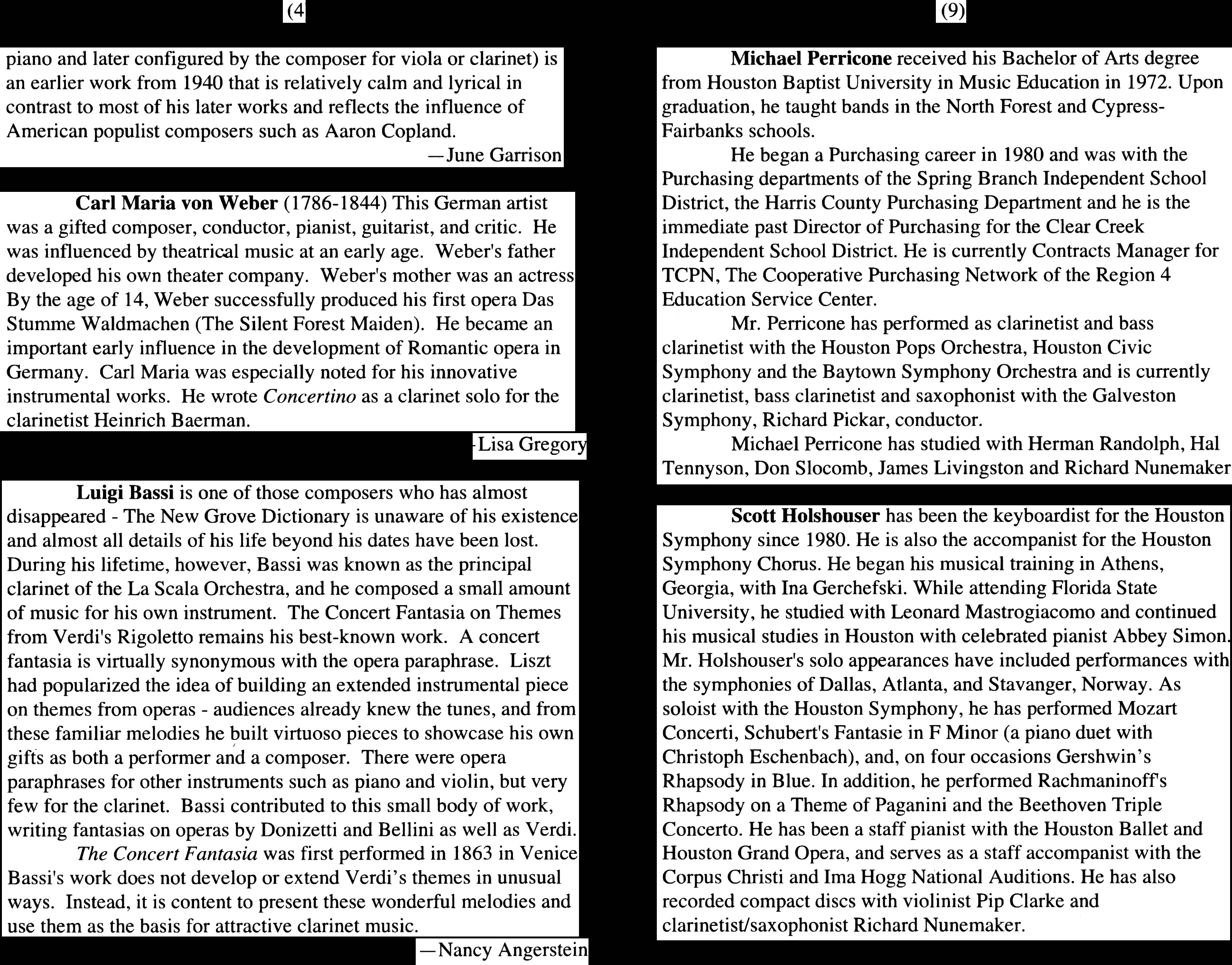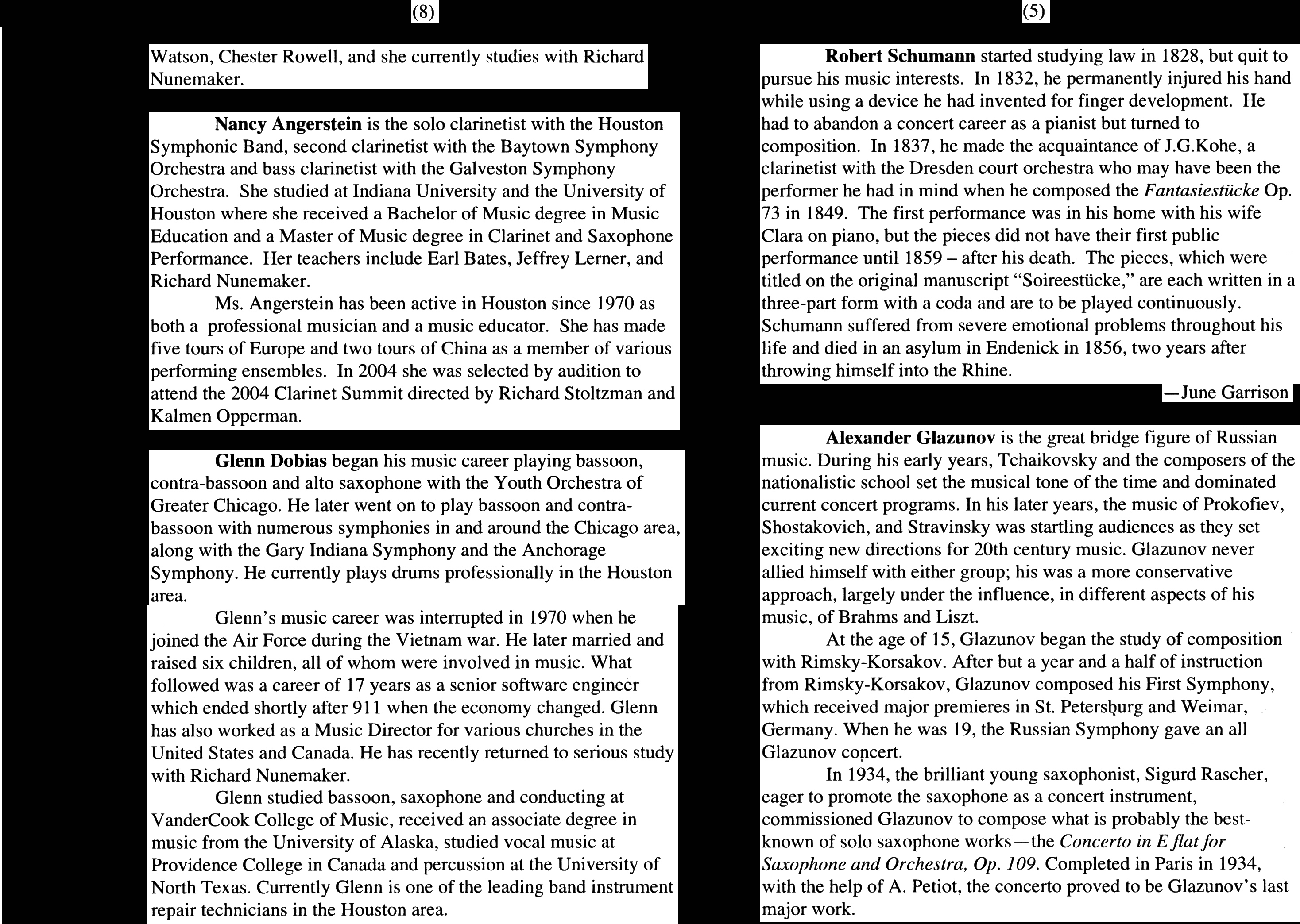 The 2nd Annual concert from this major Clarinet Studio directed by Houston Symphony Bass Clarinetist Richard Nunemaker was held at this campus with a varied unique repertoire suited for the above instruments. More program information fortcoming. Many new works for Clarinet are performed within this venue with proactive projects constantly in plan and past successes noted. Check the Clarinet Premoere Page regarding the Louisville Prohect Recording with works commissioned and performed by Mr Nunemaker. More future events are noted below: