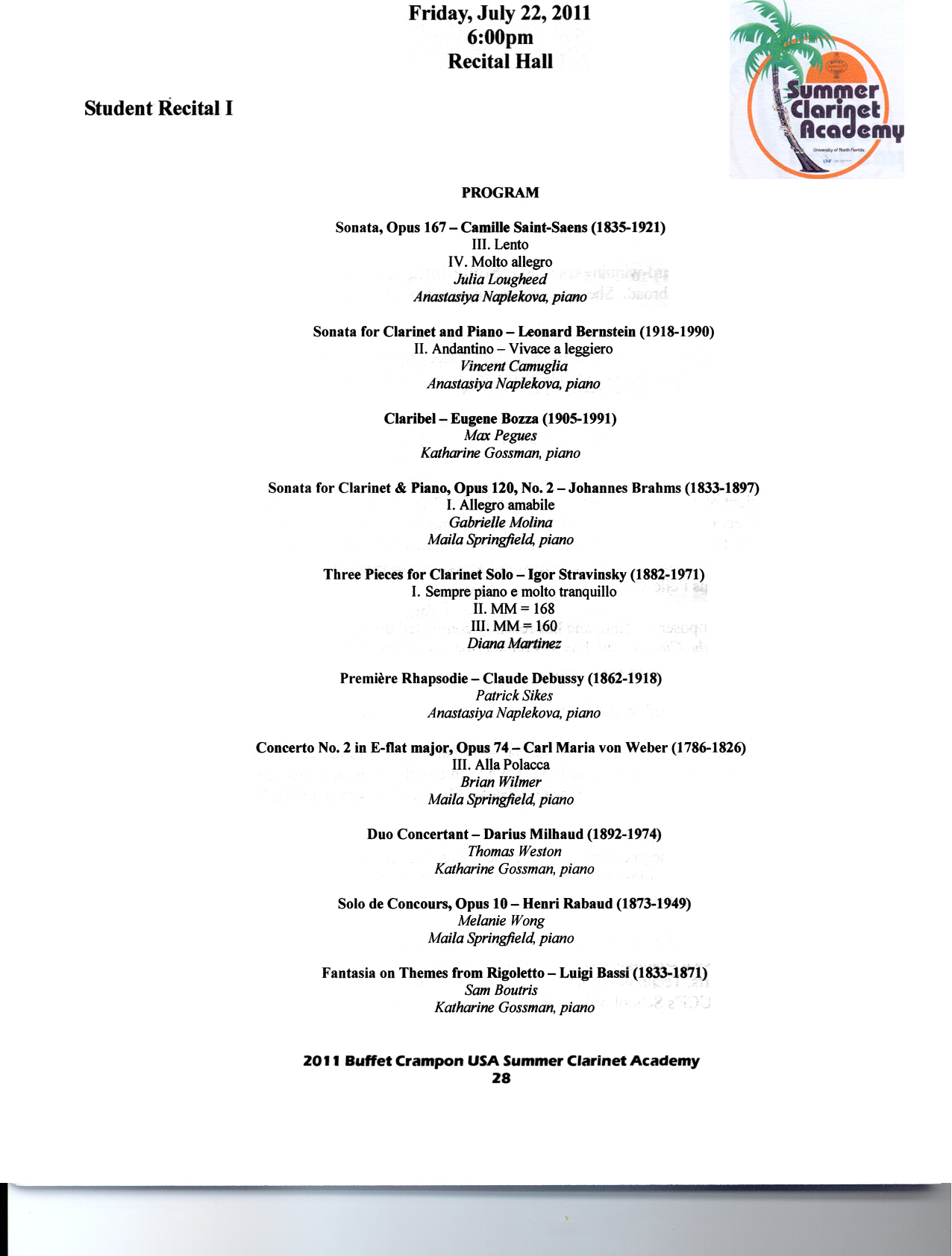 The 5th Buffet-Crampon USA Summer Clarinet Academy, with a stellar faculty of World-Class Performers and teachers, engaged with 20 pre-selected by audition students from all over the United States, many studying at the top Universities and Conservatories in this country. The purpose of this Conference was to give and engage rigorous advanced musical training in the total technical and communicative aspects of Clarinet playing, with private lessons from each of the five artist faculty, Clarinet technical training in the care and maintenance of the instrument and trouble-shooting to properly keep the instrument in top condition (provided by Artist tech Bruce Markin and Director Francois Kloc). Every day except Thursday (a day off from the intensive work) had a full calculated schedule including master classes in the afternoon, two faculty concerts, the first evening with Peter Wright, Solo Clarinetist in the Jacksonville Symphony and Clarinet colleagues, with guest Julia Heinen from California, and co-Director of the ClarinetFest 2011, and the Faculty concert with works performed by all five plus a World Premiere written for this Academy by Composer Stella Sung from the University of Central Florida in Orlando. The last two evenings featured the students performing their prepared works worked on during the week with the faculty. The results were remarkable given the short and intensive week. Programs about all events are above in the galleries.