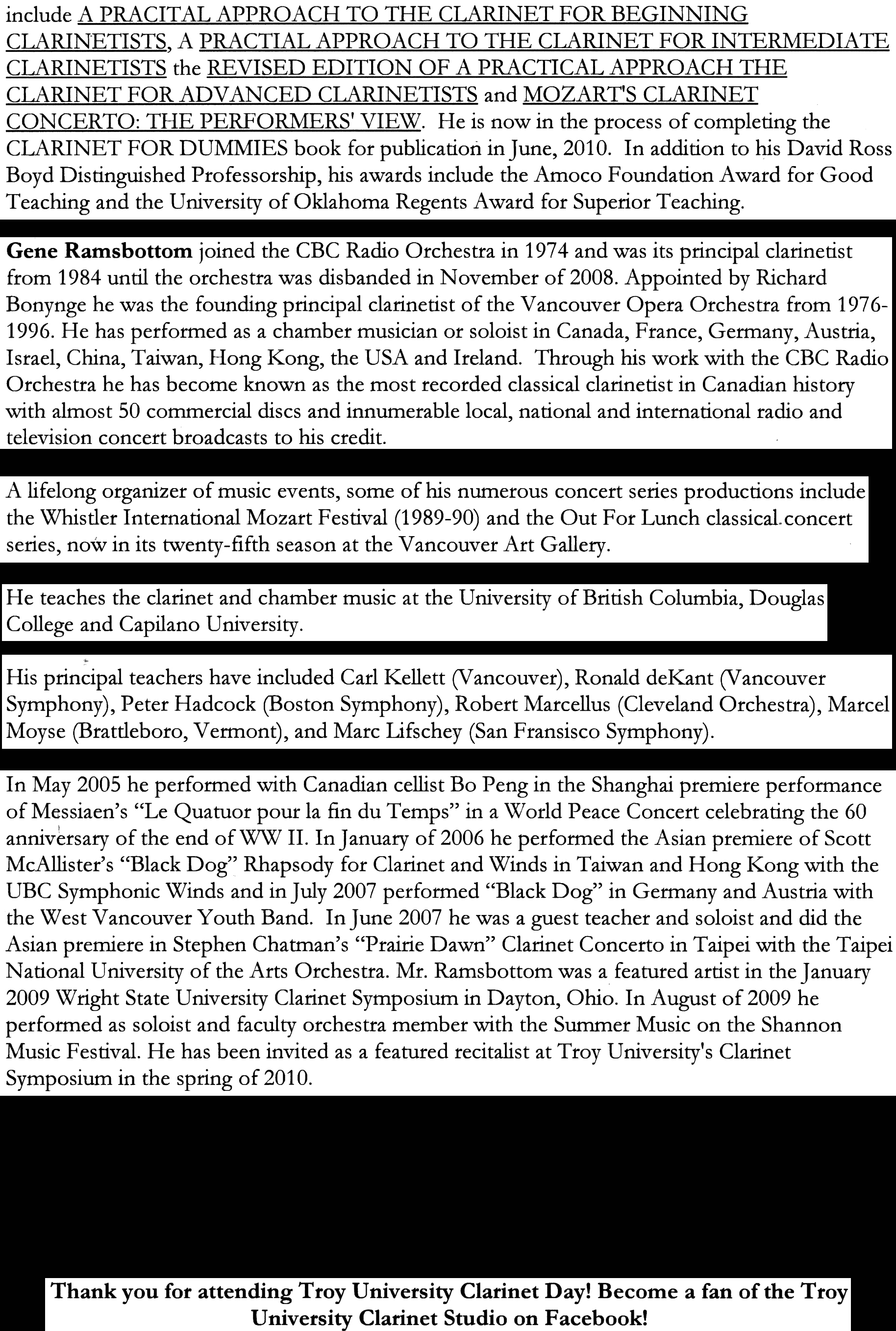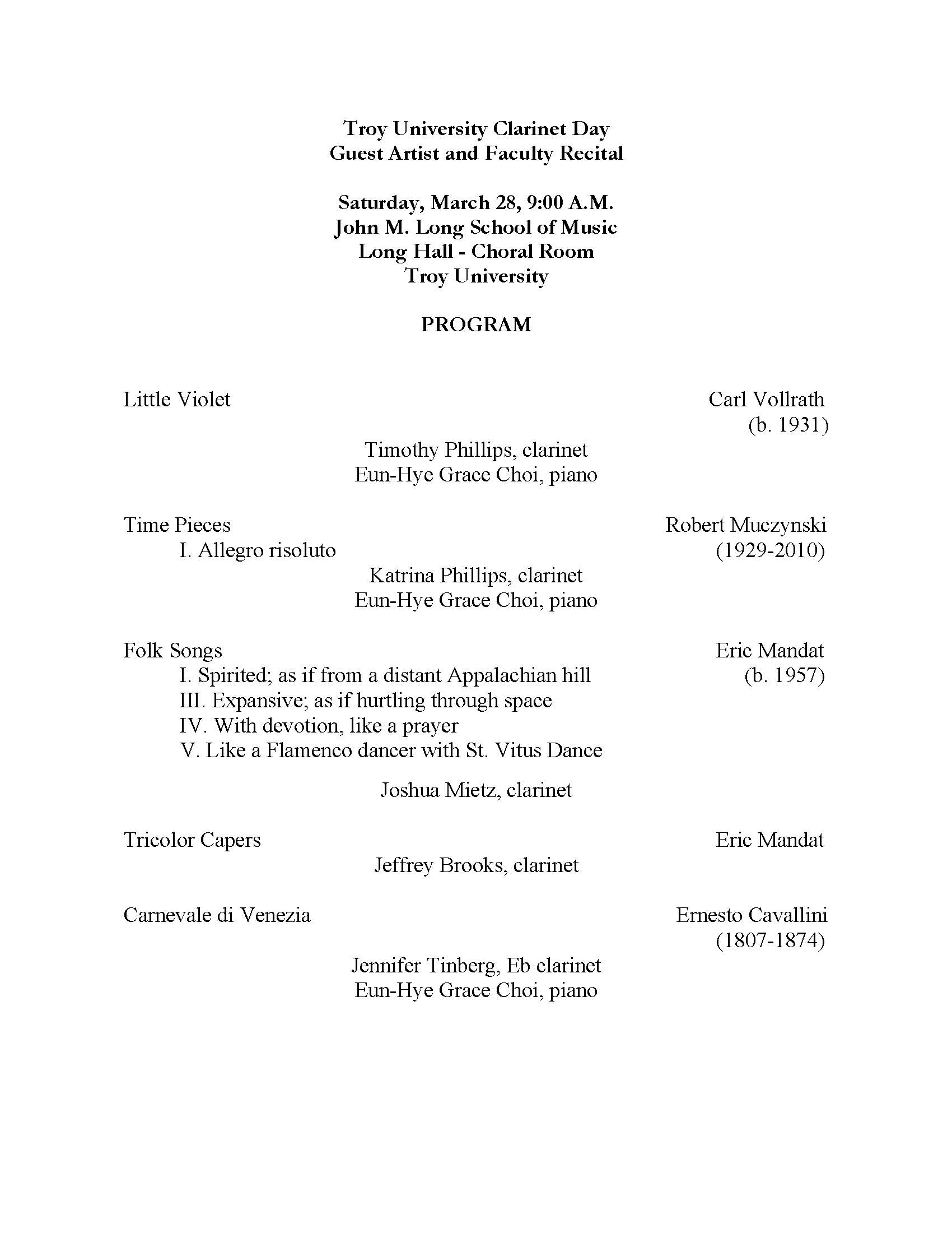 Troy University (Alabama) 3rd Annual Clarinet Day with Guest Artists Dr David Etheridge (University of Oklahoma), Gene Ramsbottom, Wojtek Komstra, and the Proha Clarinet Quartet - Dr Timothy Phillips and Dr Katrina Phillips, Directors