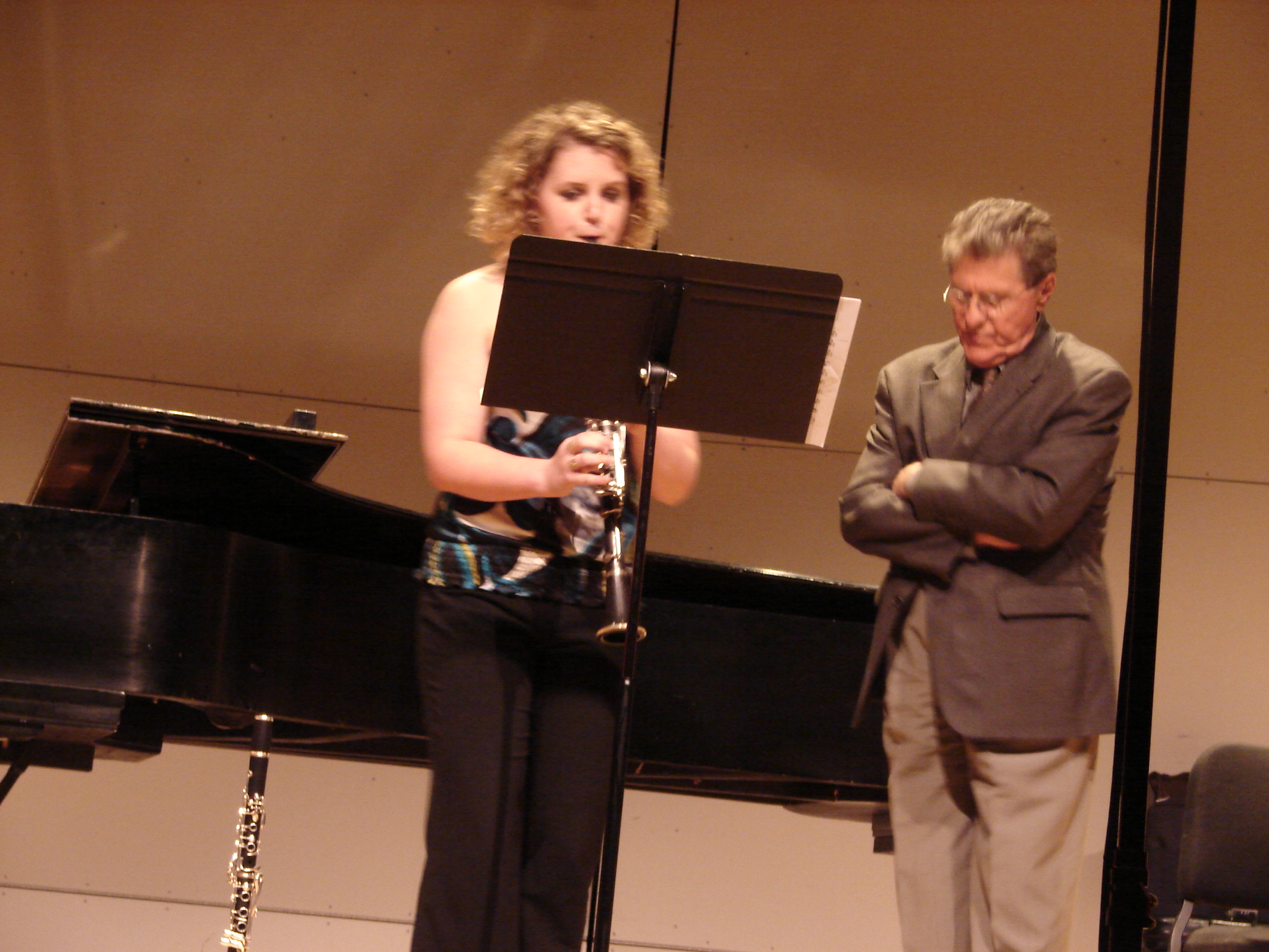 The 3rd of this weekend set of concerts and seminars was held at this small University with a full house to hear Mr Drucker in recital and to enjoy a full hour of discussion with Dr Ed Jaffe and him over his career, what it takes to achieve it, anectdotal recollections of his past in the New York Philharmonic, and a thorough history with major unique points differentiating his long career as compared to other major star artists. A major point was how Mr Drucker has raised the bar and standards of technical and musical performance with the highly noted performance recordings of works such as the Bartok Contrasts in 1954, the Debussy Premiere Rhapsody with Bernstien in 1961 (one year after being appointed Principal Clarinetist), the Nielsen Concerto with Bernstein in 1967 (recorded in one take!), and the Corigliano Concerto in 1977 with Bernstein, probbaly the most difficult Concerto ever written. Other works include his benchmark Copland Concerto, also recorded with Bernstein a year before he died. Incredulous is the only thing that can be concluded, and Mr Drucker is still running strong as his schedule now shows, as he is performing and teaching Master Classes very often at Universities around the country and abroad for Festivals and Competitions. During this seminar talk, many enthusiastic participants asked questions of all kinds and got very perceptive views and ideas. Dr Jaffe is to be credited with an important event that will have far reaching effects on all who came.