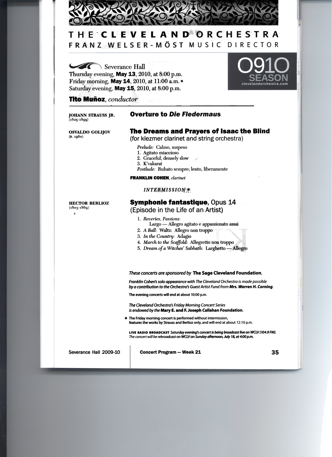 World Premiere of Chamber Orchestra version of Osvaldo Golijov 'The Dreams and Prayers of Isaac the Blind' performed by Franklin Cohen and the Cleveland Orchestra at Severence Hall and conducted by Tito Munoz 13 and 15 May 2010 |
