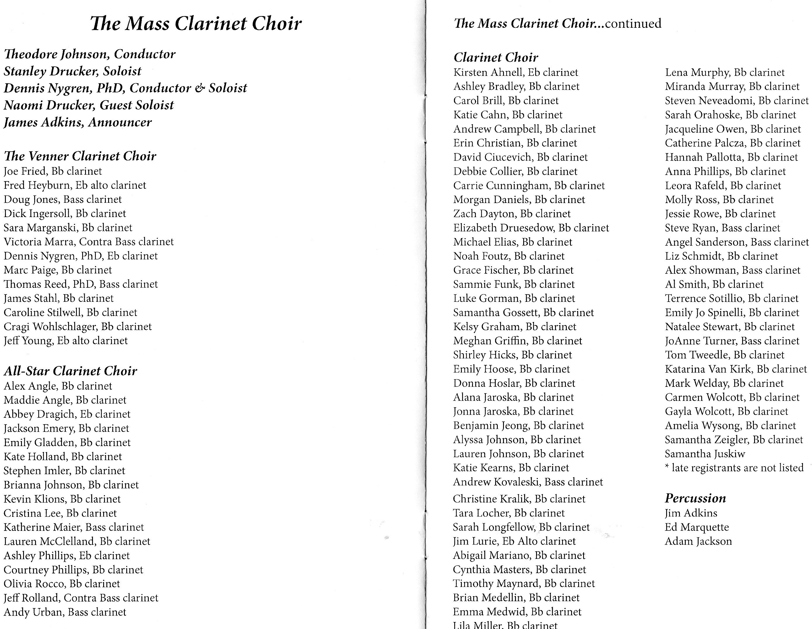 Instrument Co., provided the accompaniment for Stanley Drucker performing the Mozart Clarinet Concerto and the von Weber Concertino. Naomi Drucker joined her husband in a rare duo performance of Meyer Kupferman’s Four Double Features for Two Clarinets.
