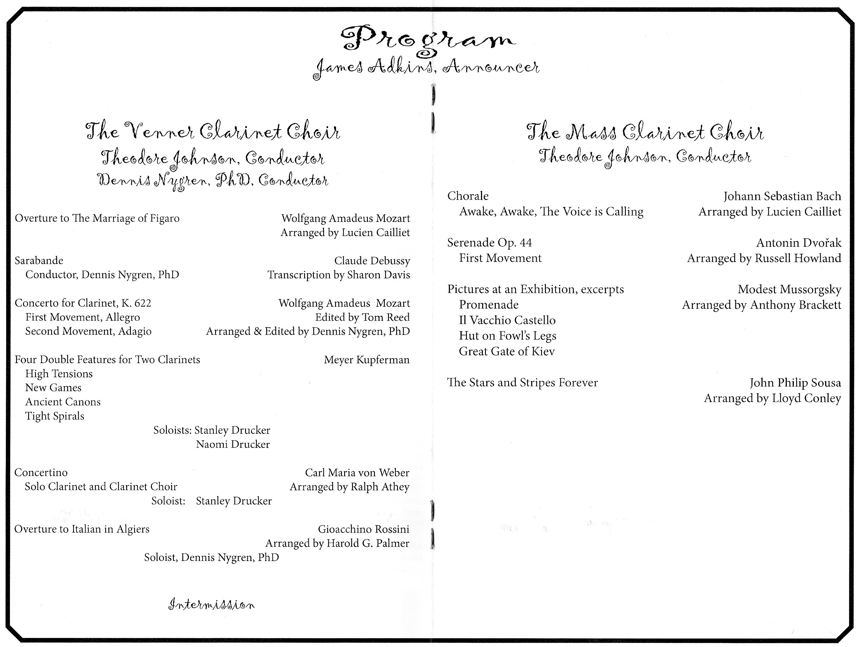 With 150 clarinets representing the entire clarinet family from the small Eb soprano to large contra bass clarinet, the sound was pure heaven. With all the musicians partipating in the final concert, the effect surpassed all preconceptions held by even the most adoring fan of the clarinet. Theodore Johnson said, “It was a giant pipe organ-like sound.”
