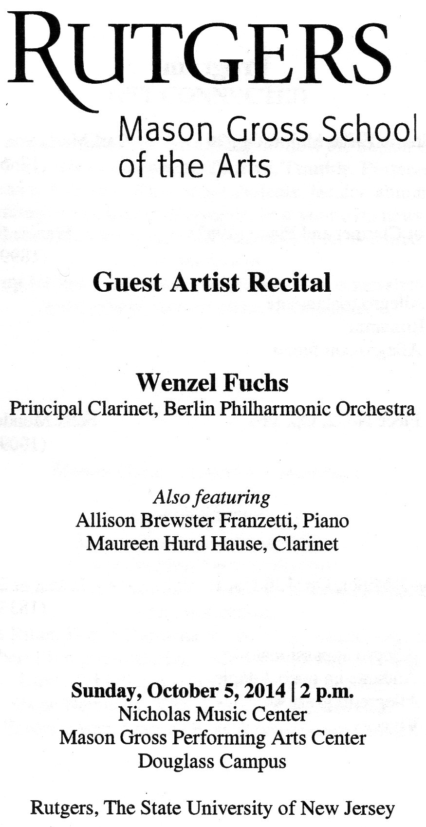 The Berliner Philharmoniker tours constantly and comes to New York to play at Carnegie Hall and other venues during their stay, and other activities take place amongst their players, giving Master Classes at schools in New York. This year, organized by CEO Mike Getzin and three Professors from the above Universities in New Jersey and Pennsylvania, Principal Klarinettist and VIP Wenzel Fuchs engaged a stunning tour de force at these 3 Institutions to great acclaim. The galleries and programs above tell the story, as intangibles are difficult to summarize, except that the coaching results with the involved students were spellbinding. At each of these schools, the Recitals given by Fuchs and the host professors were exceptional, with similar programs of known repertoire, and adding the Alfred Uhl Clarinet Quartet at Moravian College with Allentown Symphony members from their Clarinet section, and Maureen Hurd-Hause from Rutgers University and Christy Banks from Millersville University performing the Mendellsohn Concertpiece #2 on their programs. Especially for students, the recitals showcased standard works they aspire to perform and done by a master of the craft with insightful musicianship and supreme command. This was also an opportunity to hear the Wurlitzer sound and concept as played by a German Orchestra principal, as compared to the general French sound as played in the USA.