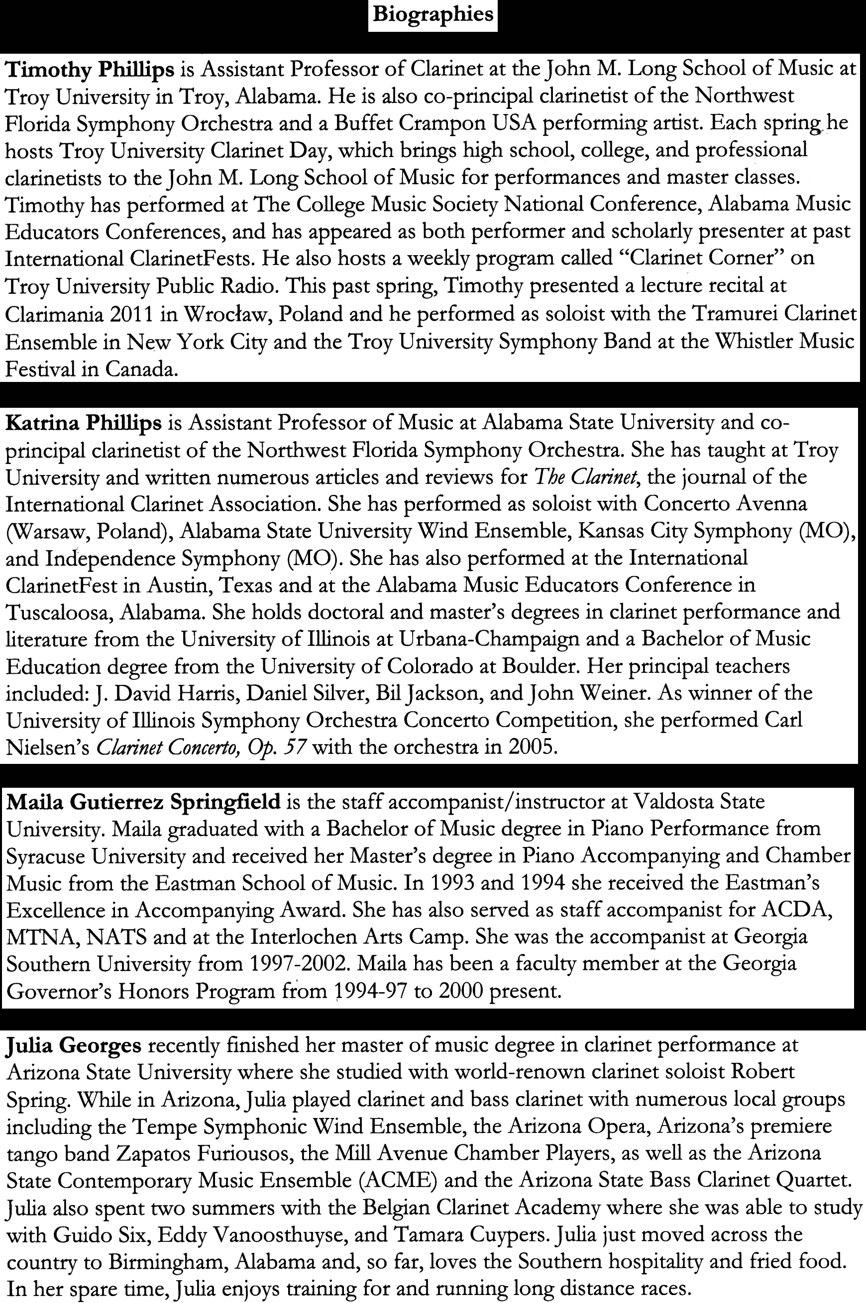 Julia Georges teaches clarinet at Troy University and is a lecturer of music at Samford University.