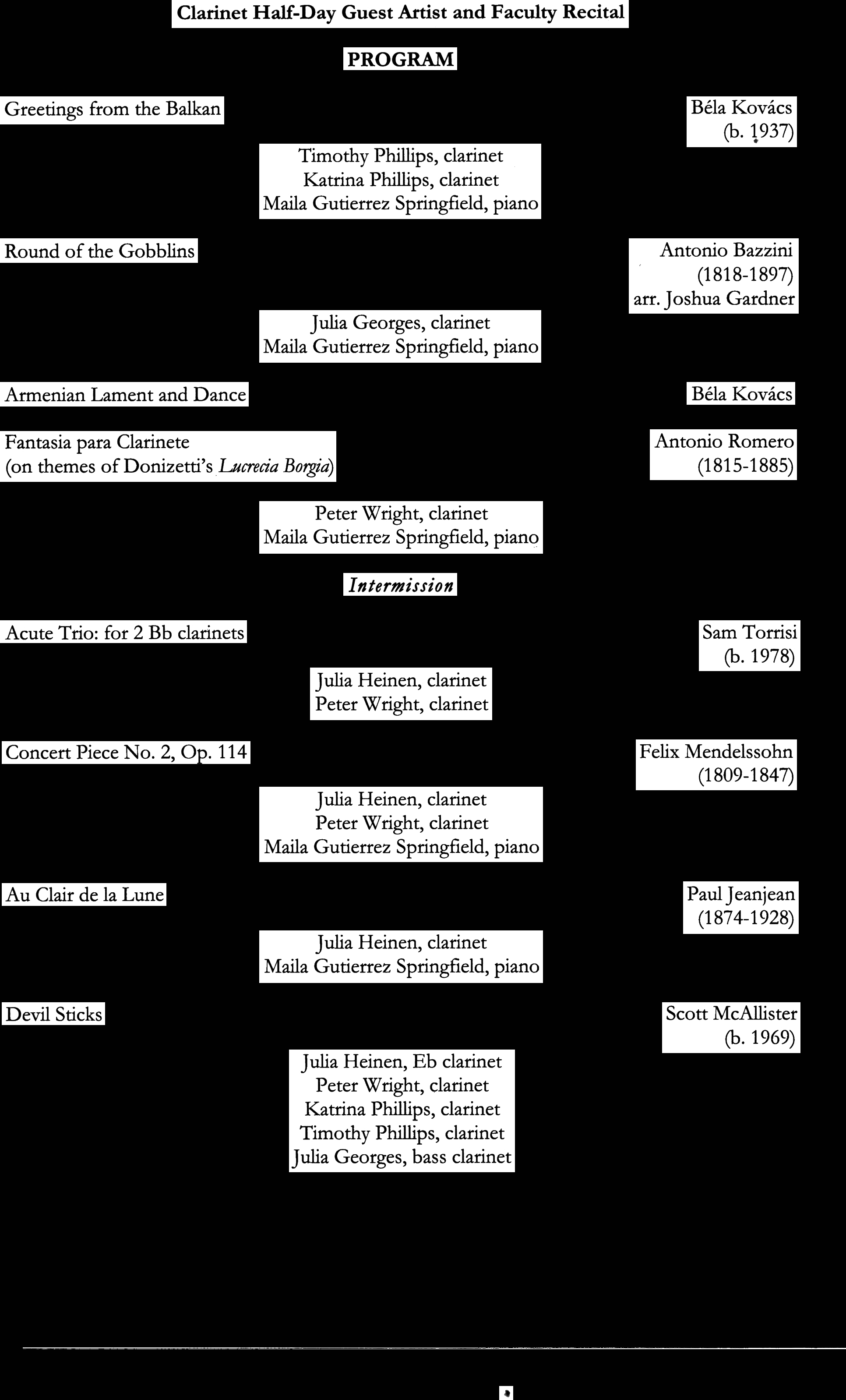 The highlight of the day was a performance featuring Dr. Julia Heinen, Peter Wright, and guest accompanist, Maila Springfield. The dynamic duo joined forces with Troy University faculty, Dr. Timothy Phillips and Julia Georges, as well as Dr. Katrina Phillips of Alabama State University, for an awesome rendition of Scott McAllister’s Devil Sticks for clarinet quintet. The entire event was a positive learning experience. Everybody left inspired and encouraged to practice.