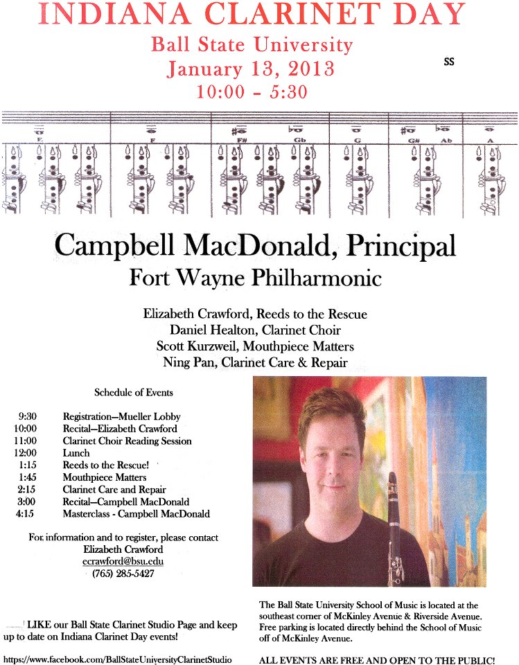 All events will take place on Saturday, March 23, 2013 in Ohio University's Robert Glidden Hall, the School of Music. The day will comprise three rehearsals in the morning and afternoon and a grand finale concert at 5:30pm. It will also include a master class by Professor Carl featuring Ohio University college students; a master class by Dr. Rischin featuring selected members of the Honors Clarinet Choir; a host recital featuring Dr. Rischin, Prof. Sincoff, Assistant Professor of Piano Youmee Kim, and Professor of Piano Gail Berenson; and a feature recital with Dr. Carl and Jan Gippo, former piccoloist with Saint Louis Symphony Orchestra, accompanied by Professors Kim and Berenson. The day will begin at 8:30am with registration and will conclude with a pizza party at 6:30pm.