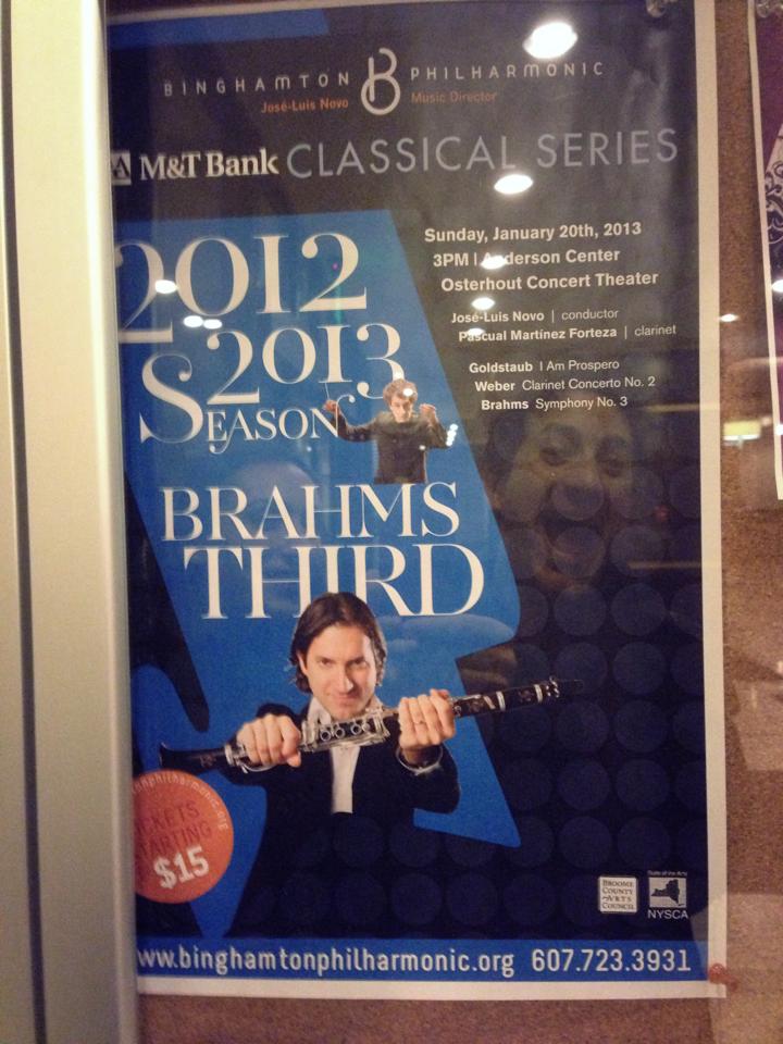 On Sunday, January 20, 2013 at 3:00 p.m. in the Osterhout Concert Theater of the Anderson Center at Binghamton University, the Bing...hamton Philharmonic, José-Luis Novo music director, will perform Weber's Clarinet Concerto No. 2, featuring soloist Pascual Martinez Forteza, the acclaimed clarinetist from the New York Philharmonic. The program also features Brahms' Symphony No. 3 and Binghamton University's own Paul Goldstaub's composition "I Am Prospero".