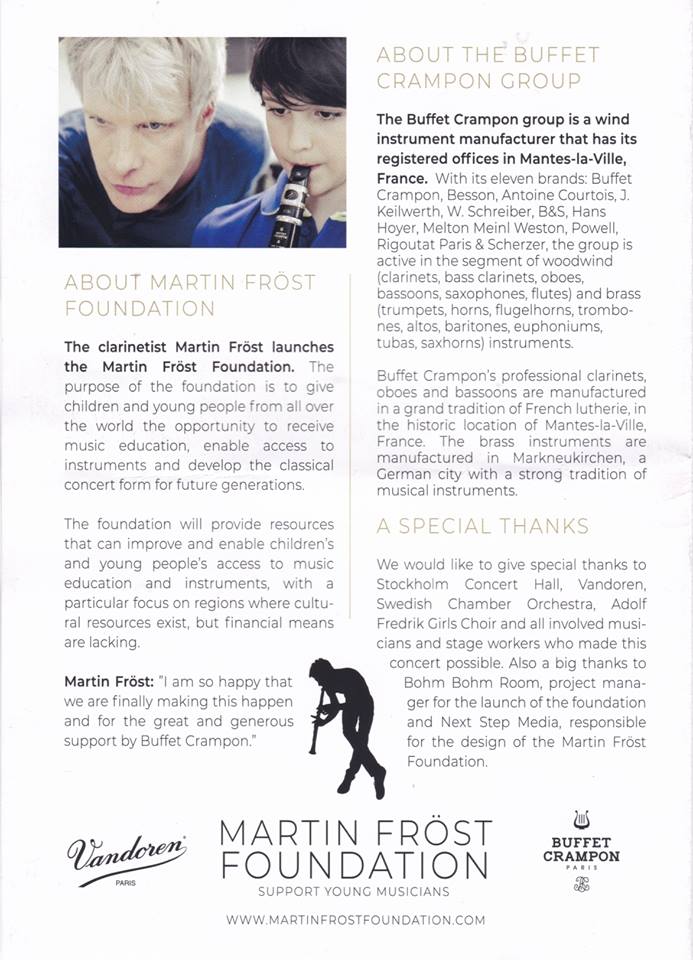 “Because of recent developments in my life, I took some important personal decisions and also made some crucial artistic choices. The most important of these was to start the foundation. I am so happy that we are finally making this happen and for the great and generous support by Buffet Crampon.” says Martin Fröst.