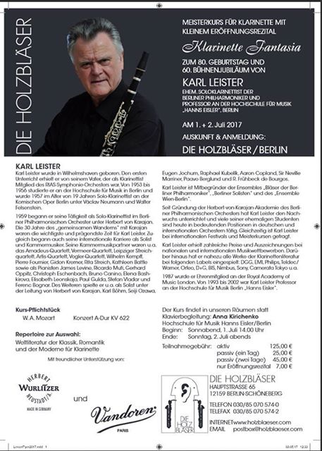 Senior VIP and Solo Klarinettist Emeritus in the Berliner Philharmoniker Karl Leister Master Classes - Berlin, Germany - 1 - 2 July 2017